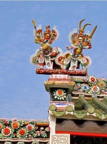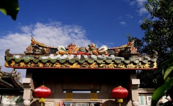 3、中脊和嵌瓷。民居中的中脊可分為高、中、低脊。一般后大廳頂為高脊,前廳為中脊,次房或花巷厝為低脊,厝頭的順延方向?yàn)榇箮?。潮汕的垂帶厝頭、脊形式多樣,十分豐富。有的可與皇家的裝飾相媲美,因有潮汕嵌瓷的大量應(yīng)用于中脊和垂帶頭。形成了全世界獨(dú)一無二的屋頂裝飾獨(dú)特景觀。常見的有中脊通花嵌瓷、浮肚嵌瓷。神廟脊上龍鳳及百花百鳥,瑞獸、吉祥圖案嵌瓷作品。是潮式建筑中的一道亮麗風(fēng)景線。嵌瓷工藝其用料做法是采用瓷碗、瓷盤敲碎后再經(jīng)修剪,然后再一片片、一條條對合泥胚進(jìn)行面層嵌貼。它因瓷質(zhì)瓷釉都要經(jīng)過高溫形成。所以嵌瓷作品形象生動,歷久而不變形不褪色,它是潮汕地區(qū)一種獨(dú)特的民族建筑裝飾工藝。